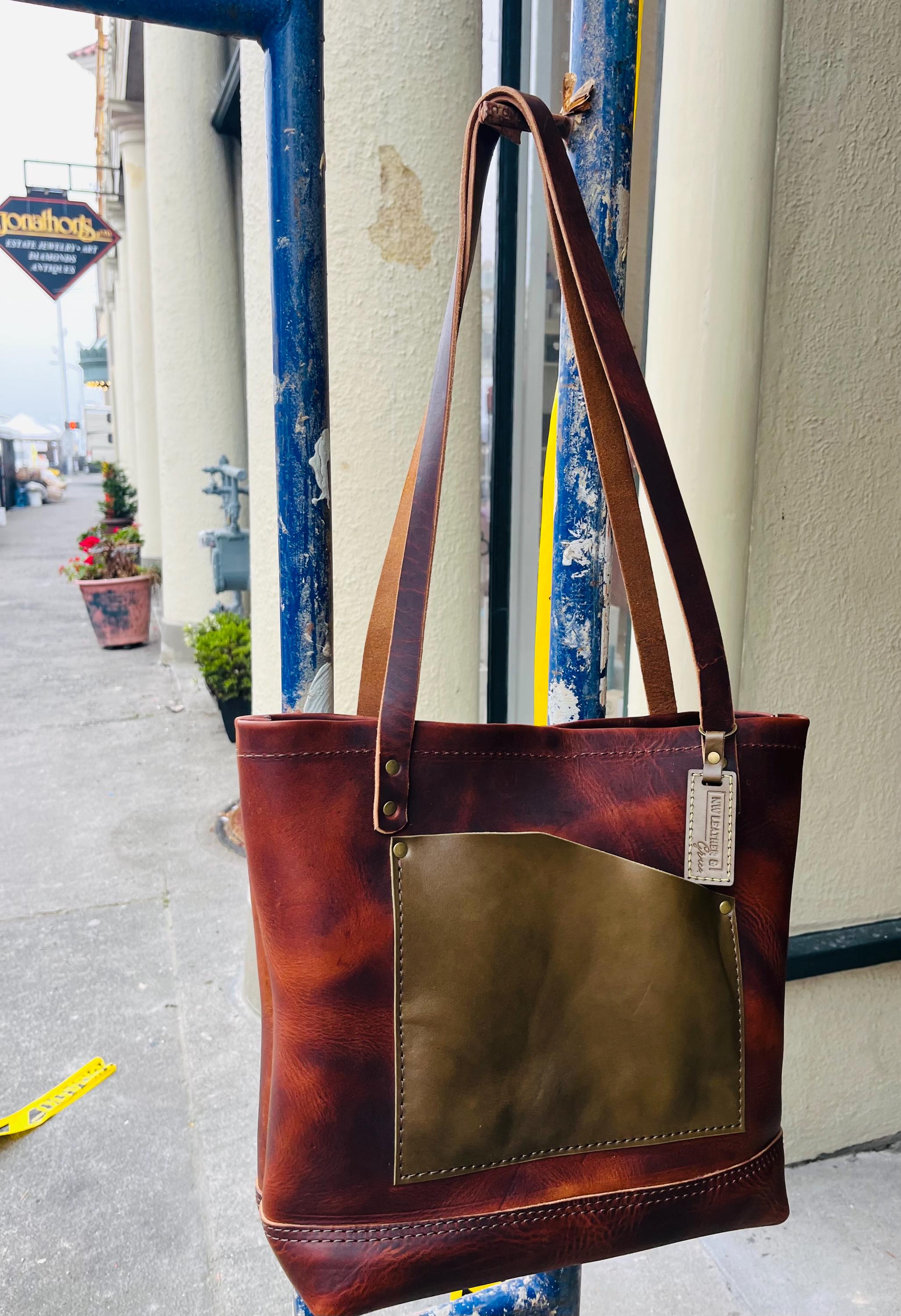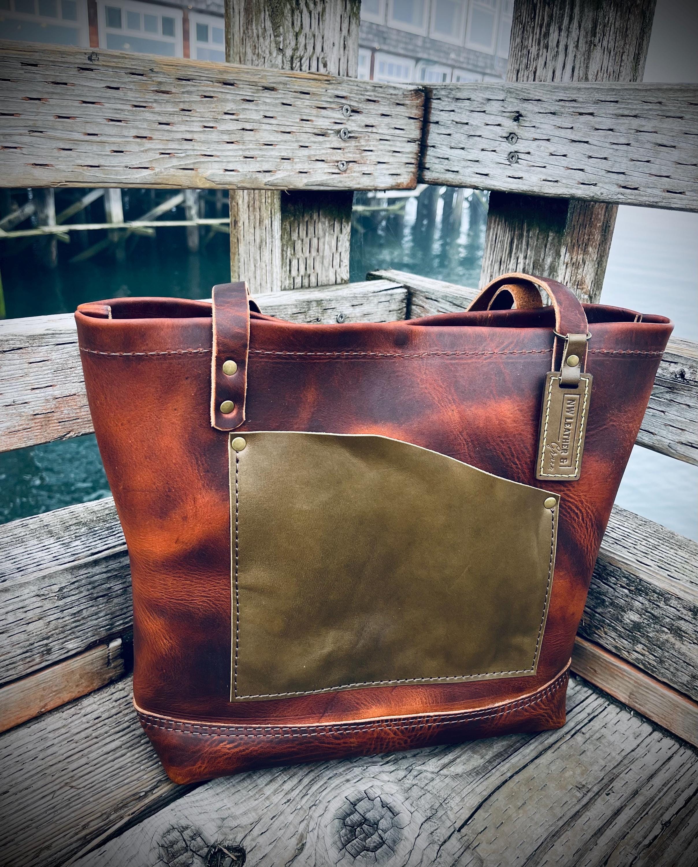 The tote features one inside pocket and one outside pocket for easy organization, along with a vegetable-tanned leather strap and U.S.-made hardware secured with industrial rivets for lasting strength. An inside key clip keeps essentials close at hand, and the unlined interior shows the natural beauty of the leather.